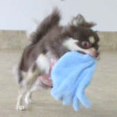 ふわふわの手袋をくわえて楽しそう♪