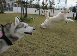週末久しぶりの屋外ドッグランの芝生を気持ち良さそうにおともだちが